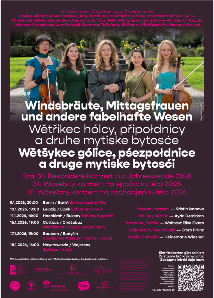 Die für das Konzert beauftragten sorbischen oder ihnen nah verbundenen Komponisten (Jan Cyz, Sebastian Elikowski-Winkler, Johannes Kretschmer, John McNabb, PeterWittig) lassen sich von dem Thema inspirieren und komponieren je ein Werk für unterschiedliche Besetzungen von Solo, Trio bis Quintett, das in den Konzerten zur Uraufführung kommen wird. Spannende, leidenschaftliche und himmlisch schöne Werke von u.a. Amy Beach, Rebecca Clarke, Lilli Boulanger, Lera Auerbach, Cecile Chaminade, Maddalena Sirmen, Pauline Viardot, Germaine Tailleferre, Heidemarie Wiesner und Ulrich Pogoda runden das Programm ab.